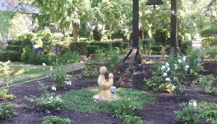 Lebensjahrs beigesetzt werden. Im Mittelpunkt dieser Anlage steht ein Brunnen, der eine Mutter mit